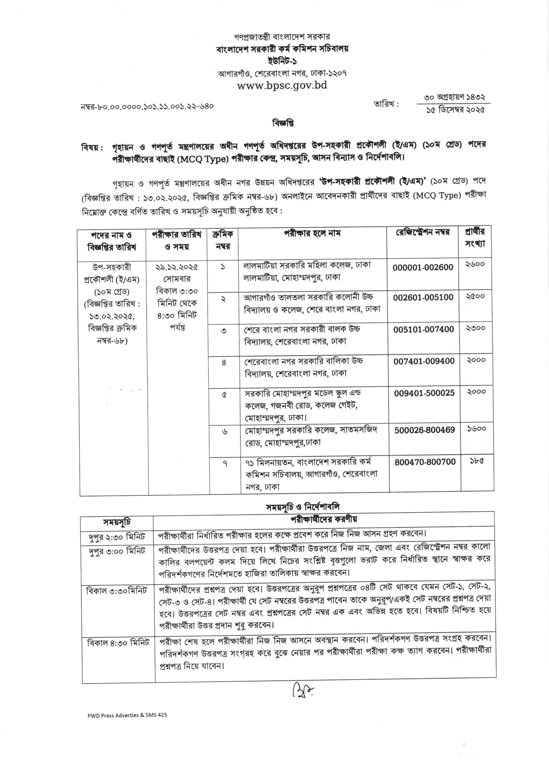 গৃহায়ন ও গণপূর্ত মন্ত্রণালয়ের অধীন গণপূর্ত অধিদপ্তরের উপ-সহকারী প্রকৌশলী (ই-এম) (১০ম গ্রেড) পদের পরীক্ষার্থীদের বাছাই (MCQ Type) পরীক্ষার কেন্দ্র, সময়সূচি, আসন বিন্যাস। পরীক্ষার তারিখঃ ২৯ ডিসেম্বর ২০২৫।